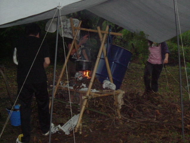 合同班キャンプです。班長の指示の下、頑丈な立ちかまどができました。雨でも平気。うどんで、おなか一杯。幸せを感じました。リーダはバーナで銘々ごはん炊き。VSは銘々ごはん炊きできるのかな?バーナ使えるのかな??