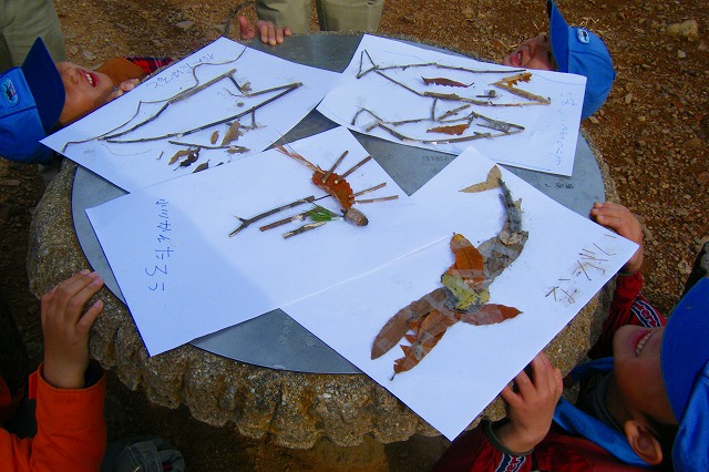昼食後、落ち葉を拾い集め貼り絵を行いました。中には作者の説明を聞かなければ理解出来ない作品もありましたが短時間で仕上げた作品は素晴らしかったです。 午後1時に西山登山口をめざして下山を開始しました。下山ルートは登ってきたルートよりも倍ぐらいの距離があり多少のアップダウンもありスカウトたちにとってはちょっと厳しいルートかと思っていましたが、なんのその疲れを知らないちびっ子スカウトでした。むしろ、指導者のほうが疲れたかも...。 午後2時30分に途中休憩をはさみながら西山登山口に下山。 お疲れ様でした。 |